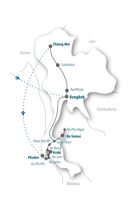 Gut sechs Wochen lang, vom 07.10. bis zum 18.11.2004 waren wir mit dem Rucksack in Thailand unterwegs. Zunächst besuchten wir von Bangkok aus mit dem Zug den Norden des Landes mit Zwischenstopps in den alten Königsstädten Ayutthaya und Sukhothai.